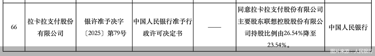 北京商报讯(记者岳品瑜董晗萱)关注稳定币、冲击H股……近期广受市场热议的拉卡拉(300773)又有新动态。6月29日,北京商报记者注意到,据人民银行官网更新的非银行支付机构重大事项变更信息,同意拉卡拉支付股份有限公司(以下简称“拉卡拉”)主要股东联想控股股份有限公司(以下简称“联想”)持股比例由26.54%降至23.54%。变更后,联想仍是拉卡拉最大机构股东。